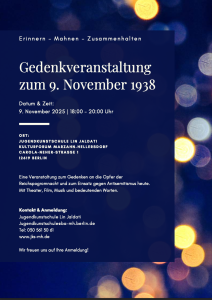 « Alle Veranstaltungen Gedenkveranstaltung | Kulturforum in Marzahn-Hellersdorf November 9 @ 6:00 p.m. - 8:00 p.m. « Folkadu feat. Yaser Bayat | Panda Platforma | Berlin Zum Kalender hinzufügen Google Kalender iCalendar Outlook 365 Outlook Live Details Datum: November 9 Zeit: 6:00 p.m. - 8:00 p.m. Veranstaltungsort Kulturforum in Marzahn-Hellersdorf Carola-Neher-Str. 1 Berlin, 12619 Google Karte anzeigen